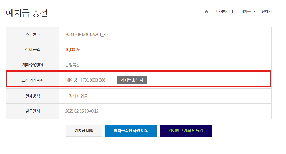 K뱅크 통장이 항상 필요한 것은 아니다. 두번째 고정가상계좌 충전을 사용하면 된다. 그럼 내 계정과 연결되는 고유 계좌 번호를 얻을 수 있다. 여기 정해진 금액을 입금하면 예치금 충전이 완료된다.