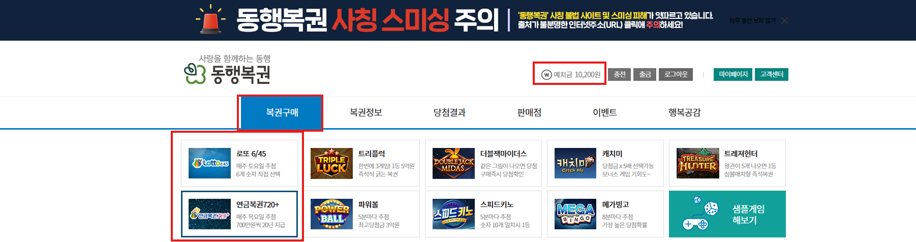 예치금 충전 후 상단 복권구매 버튼을 눌러 구매를 원하는 복권을 선택한다.