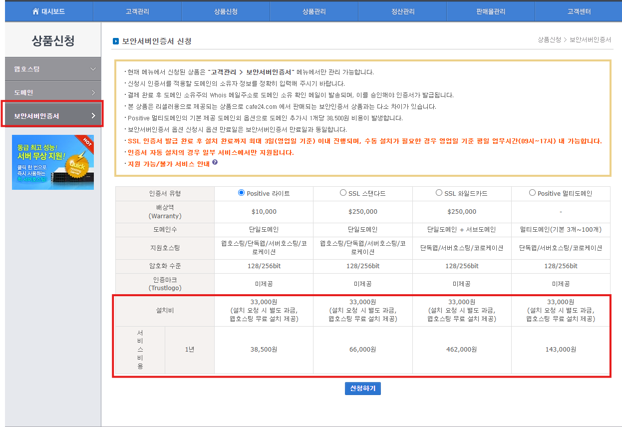 Cafe24 대시보드에서도 보안서버 인증서를 구입하여 적용 가능합니다만 가격이 비쌉니다. 추가로 최초 설치비까지 받습니다.