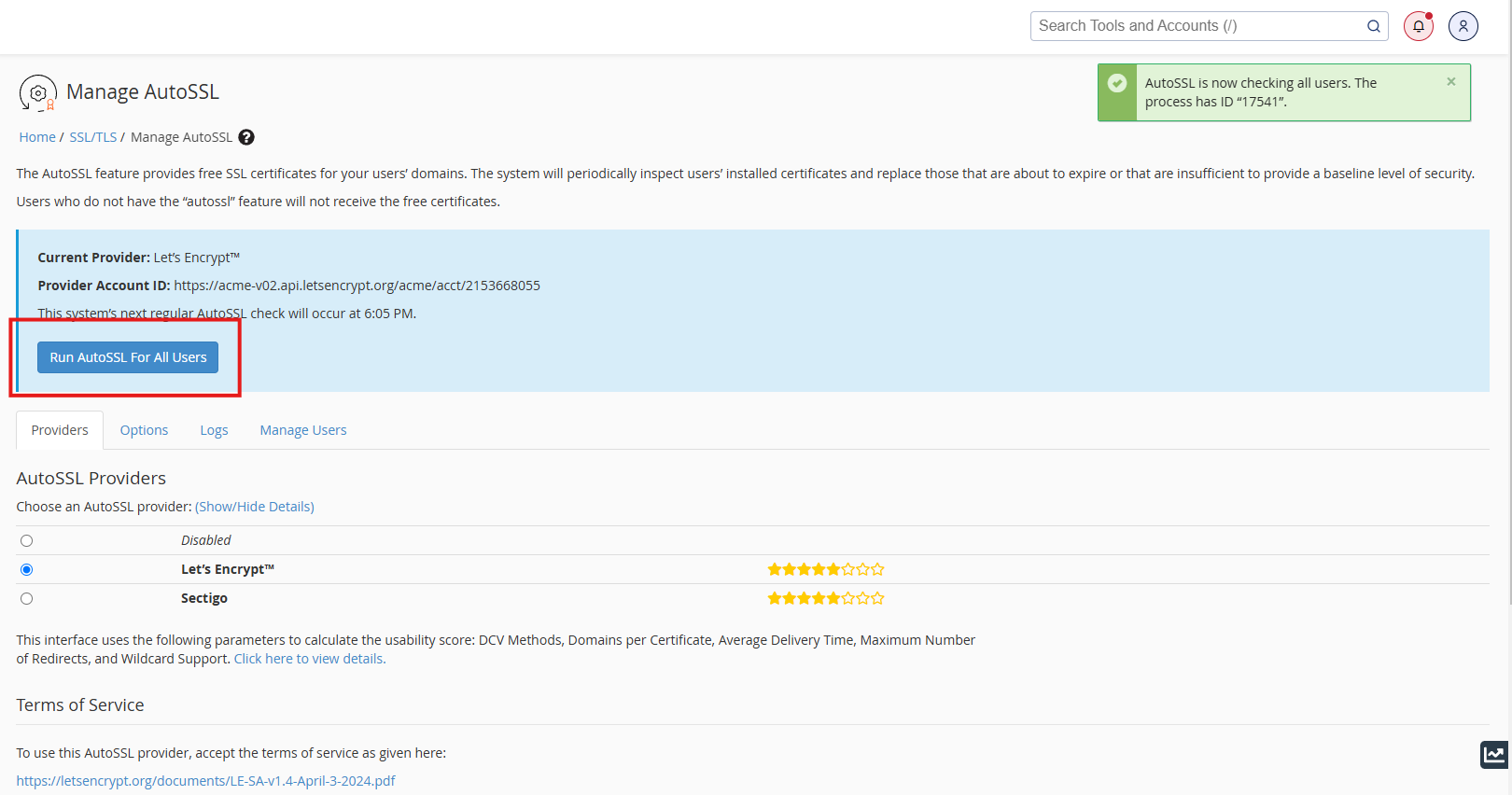 그럼 설정 완료!! 아래 AutoSSl Providers라는 항목이 나오는데 기본값인 Let's Encrypt 으로 설정 후 버튼을 누르면 됩니다.