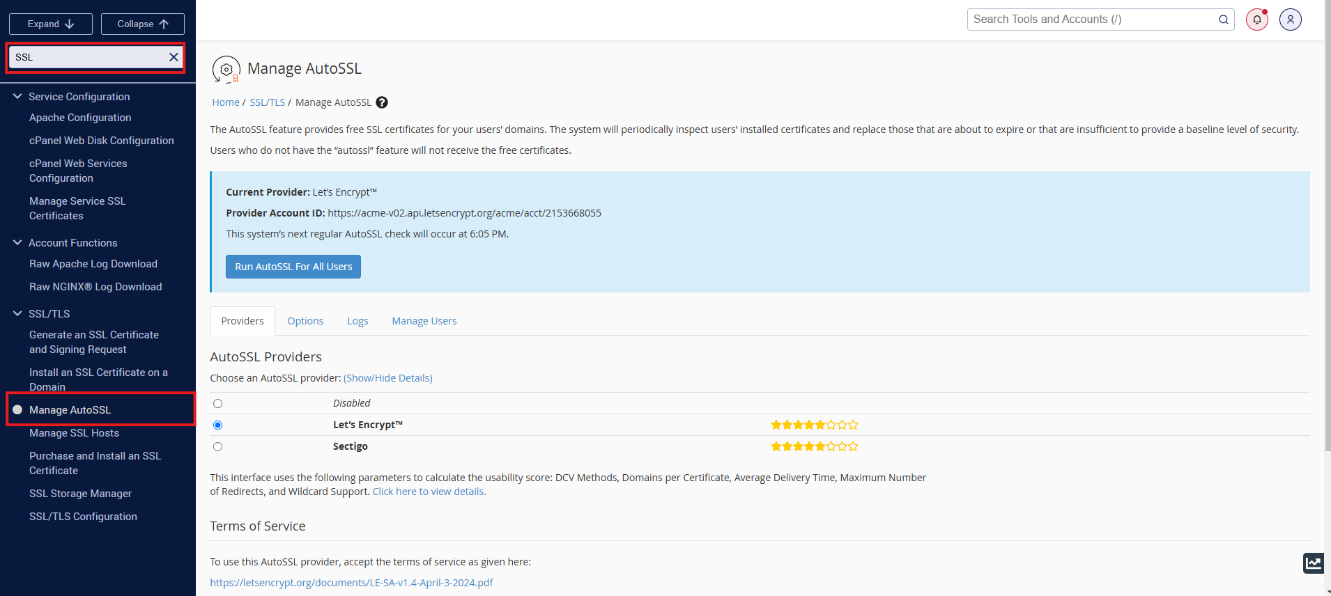 그럼 설정 완료!! 아래 AutoSSl Providers라는 항목이 나오는데 기본값인 Let's Encrypt 으로 설정 후 버튼을 누르면 됩니다.