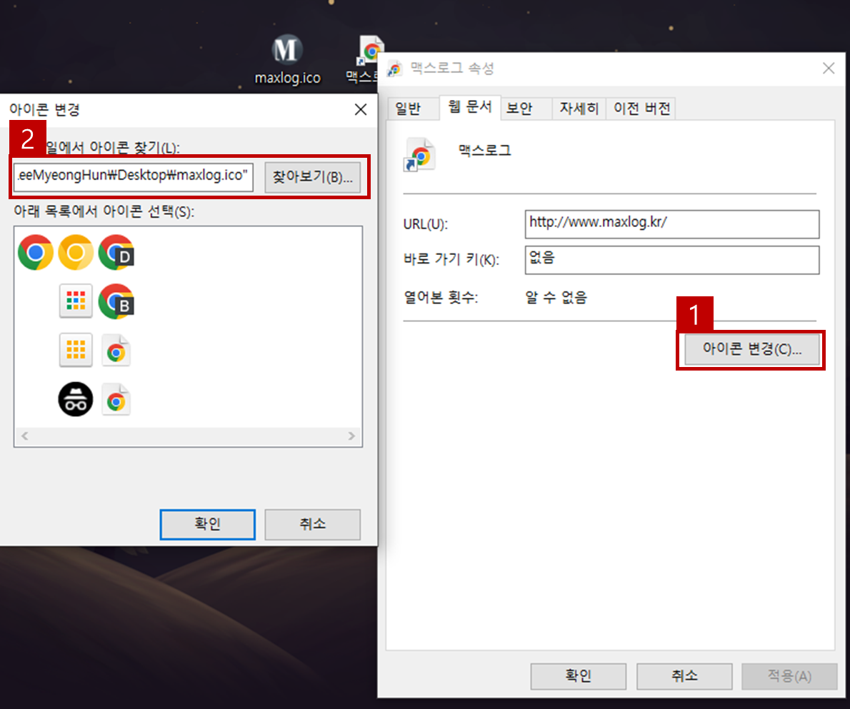 변환한 파일을 위에서 실패했던 아이콘 변경화면으로가서 바꿔주자.