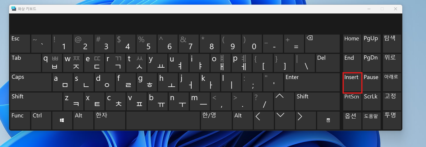 프로그램으로 INSERT키를 누르면 된다. 윈도우에서 제공하는 화상 키보드 기능을 사용하자