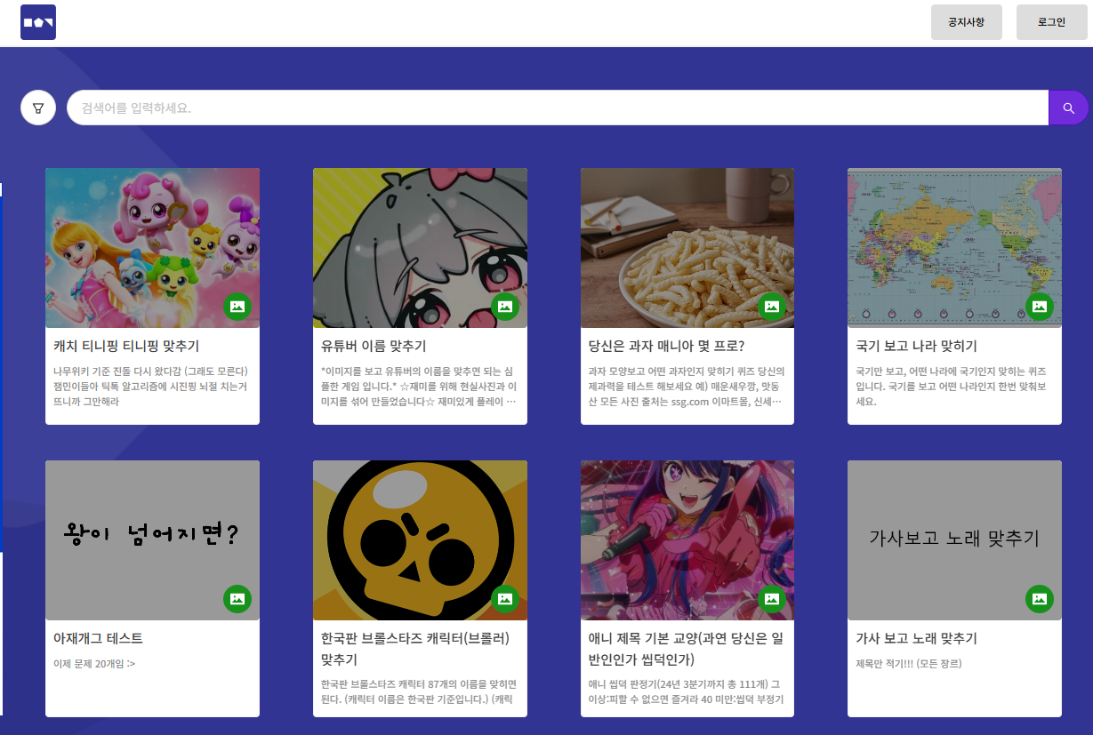대한민국의 간단 퀴즈 아이디어는 여기 다 있다고해도 과언이 아니다. 메인페이지는 무한 스크롤로 되어있는데 아무리 내려도 끝나지 않는다.