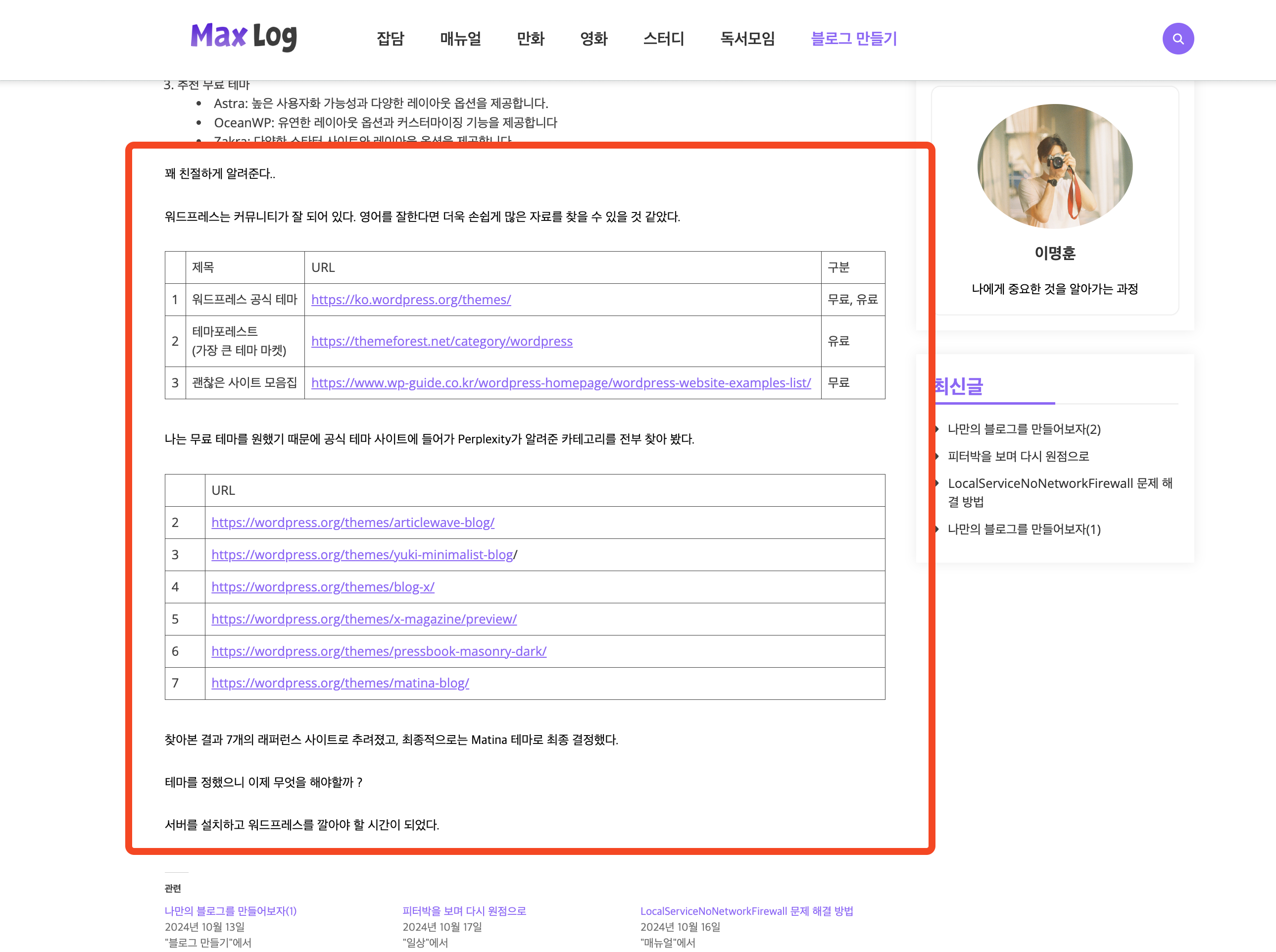 | 워드프레스 무료 블로그를 만들어보자(3) - 무료 블로그 서버 셋팅 (2) | 2024.11.18 |