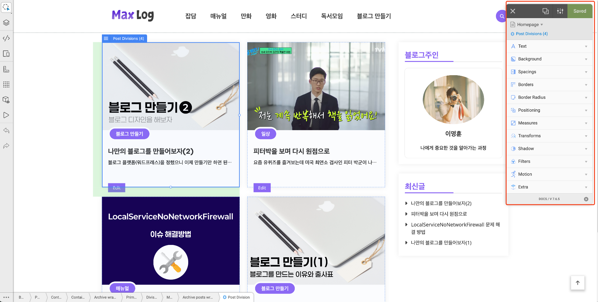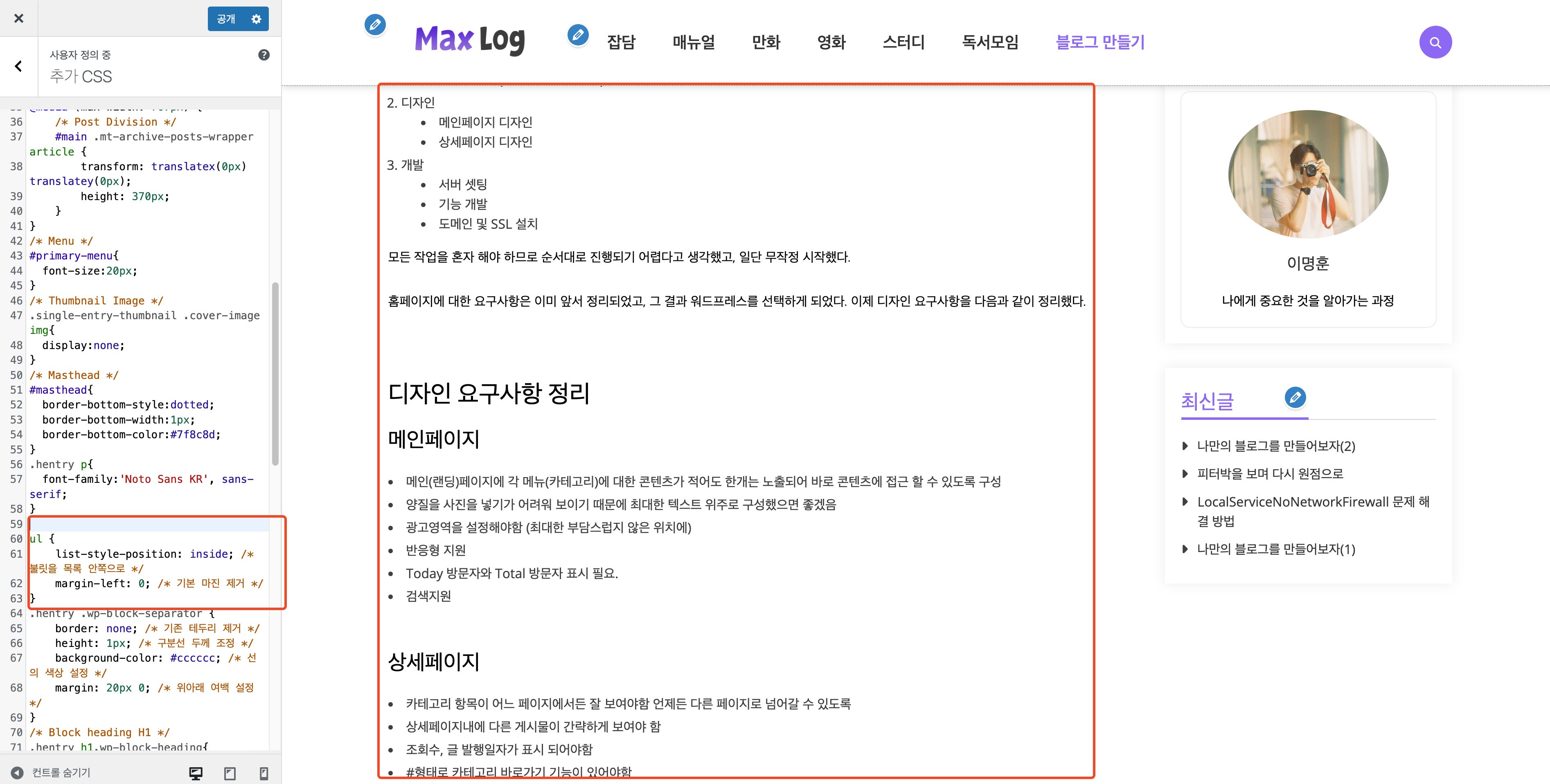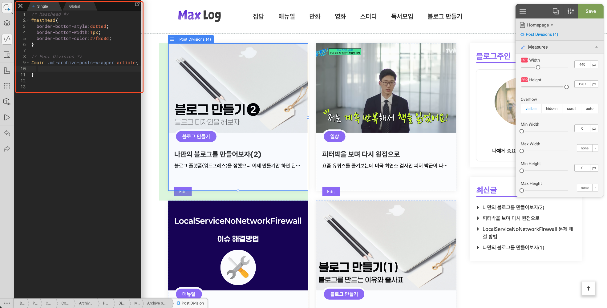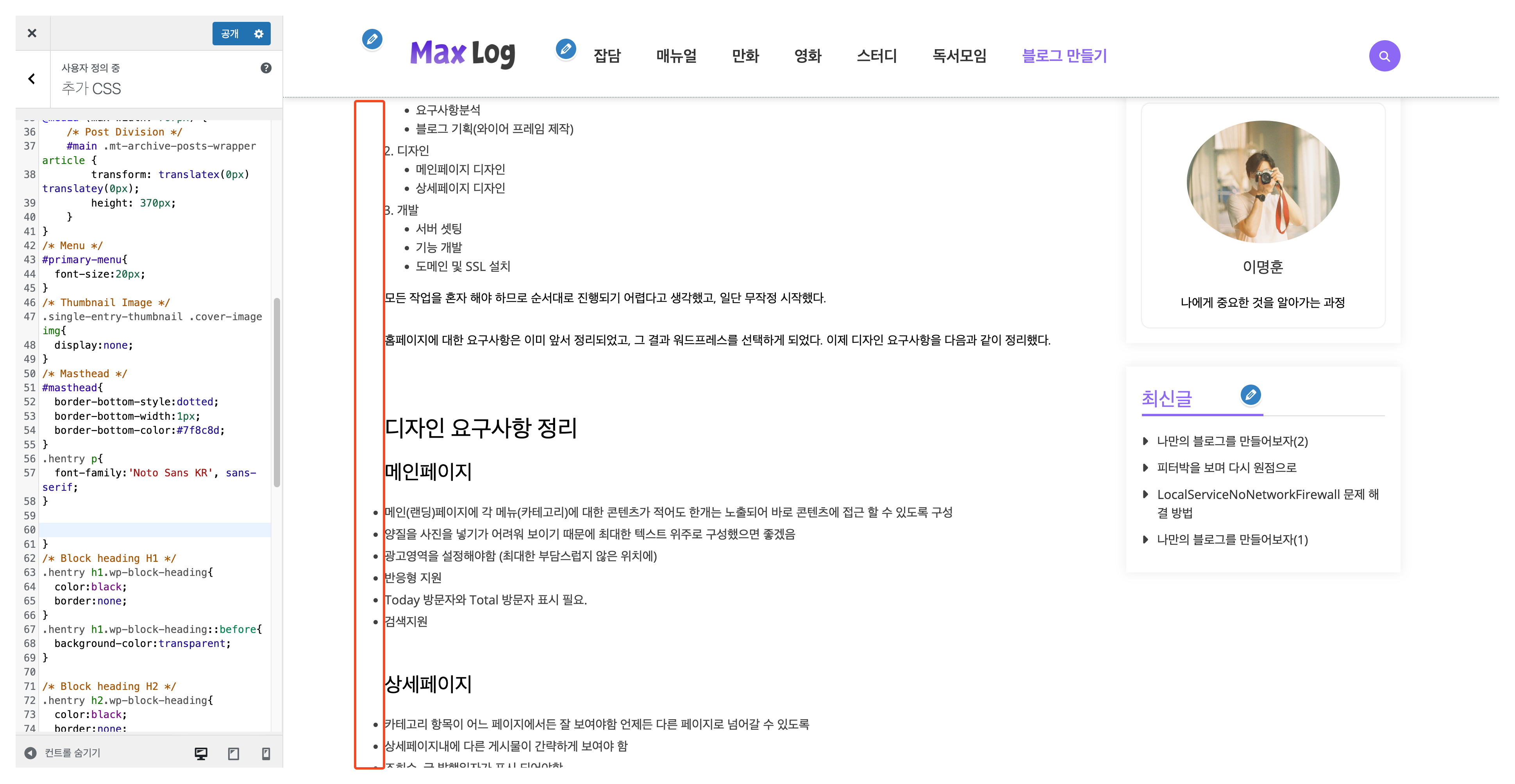 보이는가 ? 빨간색 박스의 하얀색 부분이 늘어났다. 저런 디테일한 설정은 테마에서 지원하지 않는다. 따라서 이런식으로 한땀한땀 수정을 해야한다.