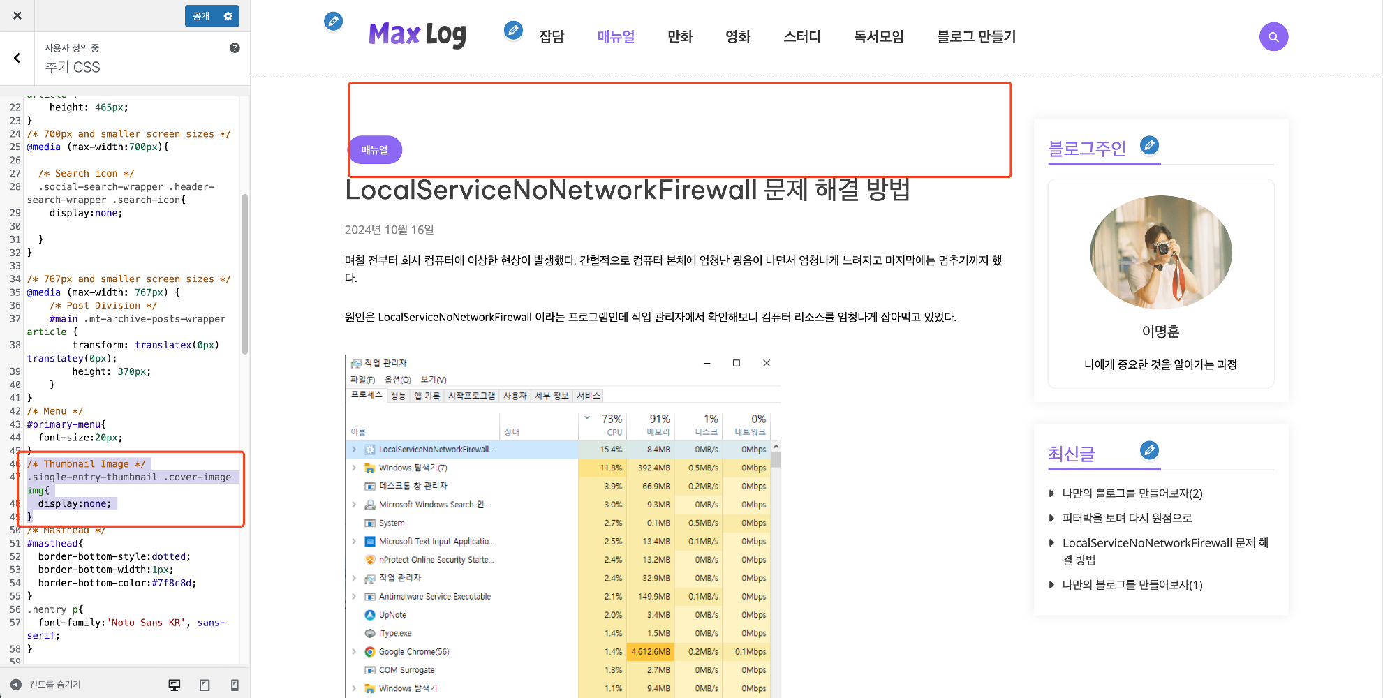사실 이 기능은 테마 설정에 있었는데 테마를 통해 썸네일 글이 처음에 노출되지 않도록 설정 할 경우 최신글이나 다른 곳에서 보이는 썸네일이 가려지는 대참사가 일어났다.(테마를 잘못만듬 아오) 따라서 기능은 살려두면서 CSS 수정을 통해 본문에만 나오지 않도록 가려준 것이다.