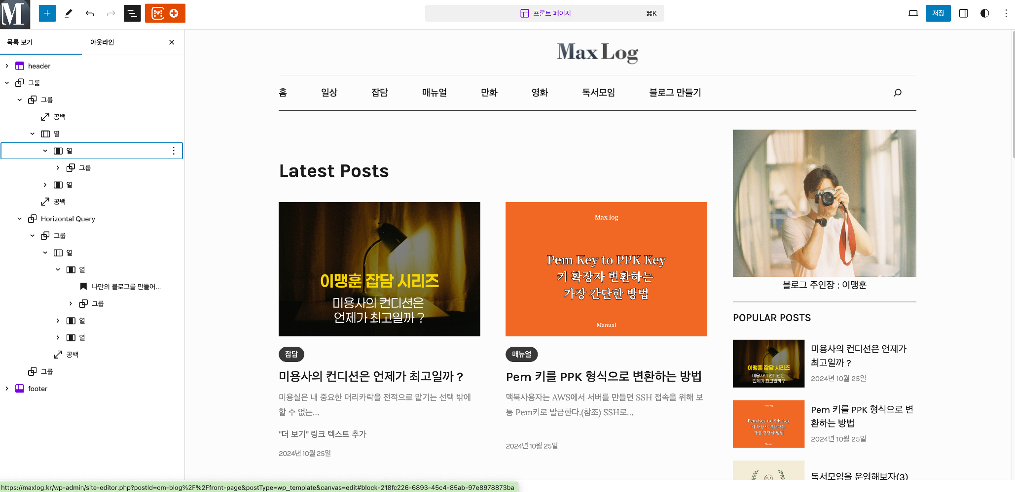우선 내가 발견한 CM Blog를 통해 워드프레스 테마 구조를 조금 알게되었다. 아래 이미지를 보면 좌측에 홈페이지 템플릿 구조가 쭉 나열된다. 그리고 그 한개의 요소를 선택하면 우측의 빨간 박스와 같이 각 요소(Block)의 값을 설정 할 수 있다.