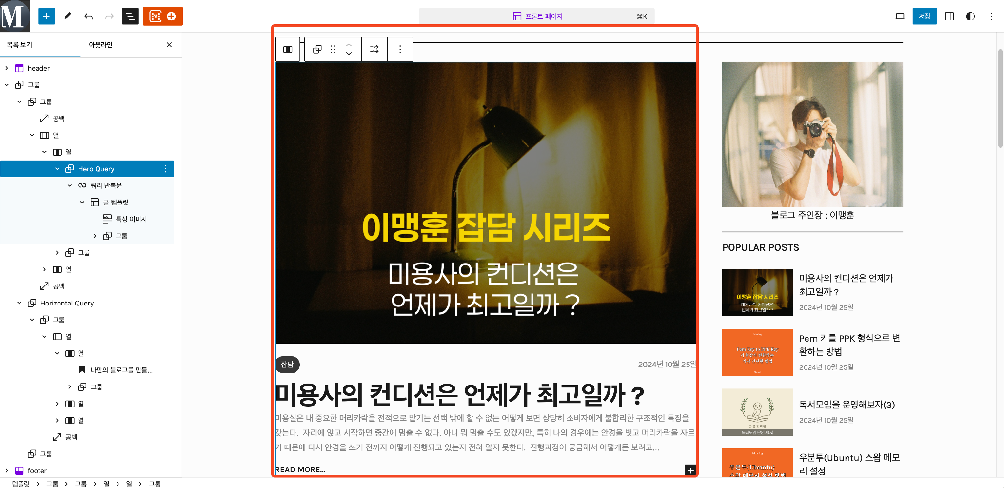 만약 메인페이지 대표글을 보여주는 영역이 너무 커서 부담스럽다면