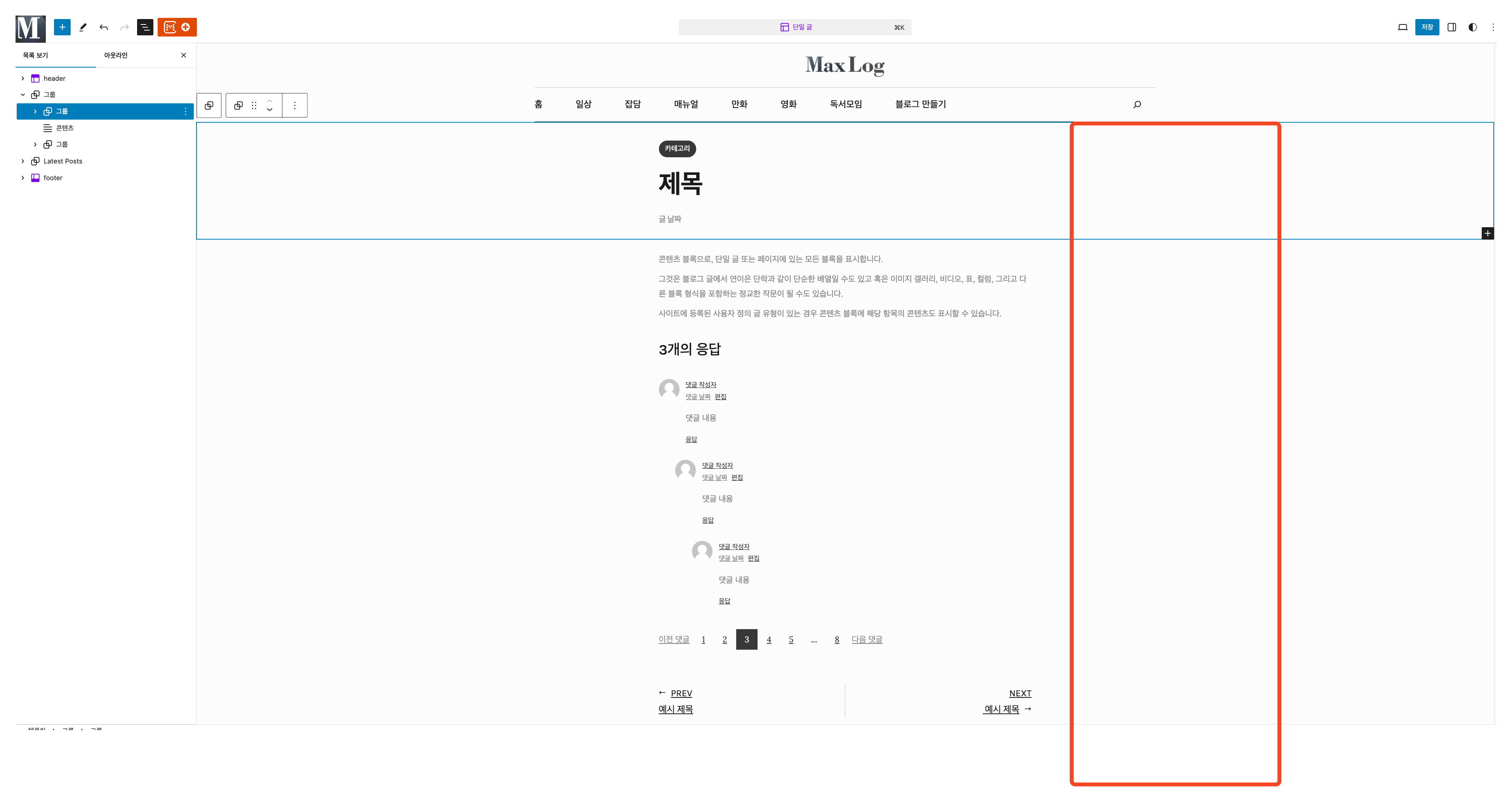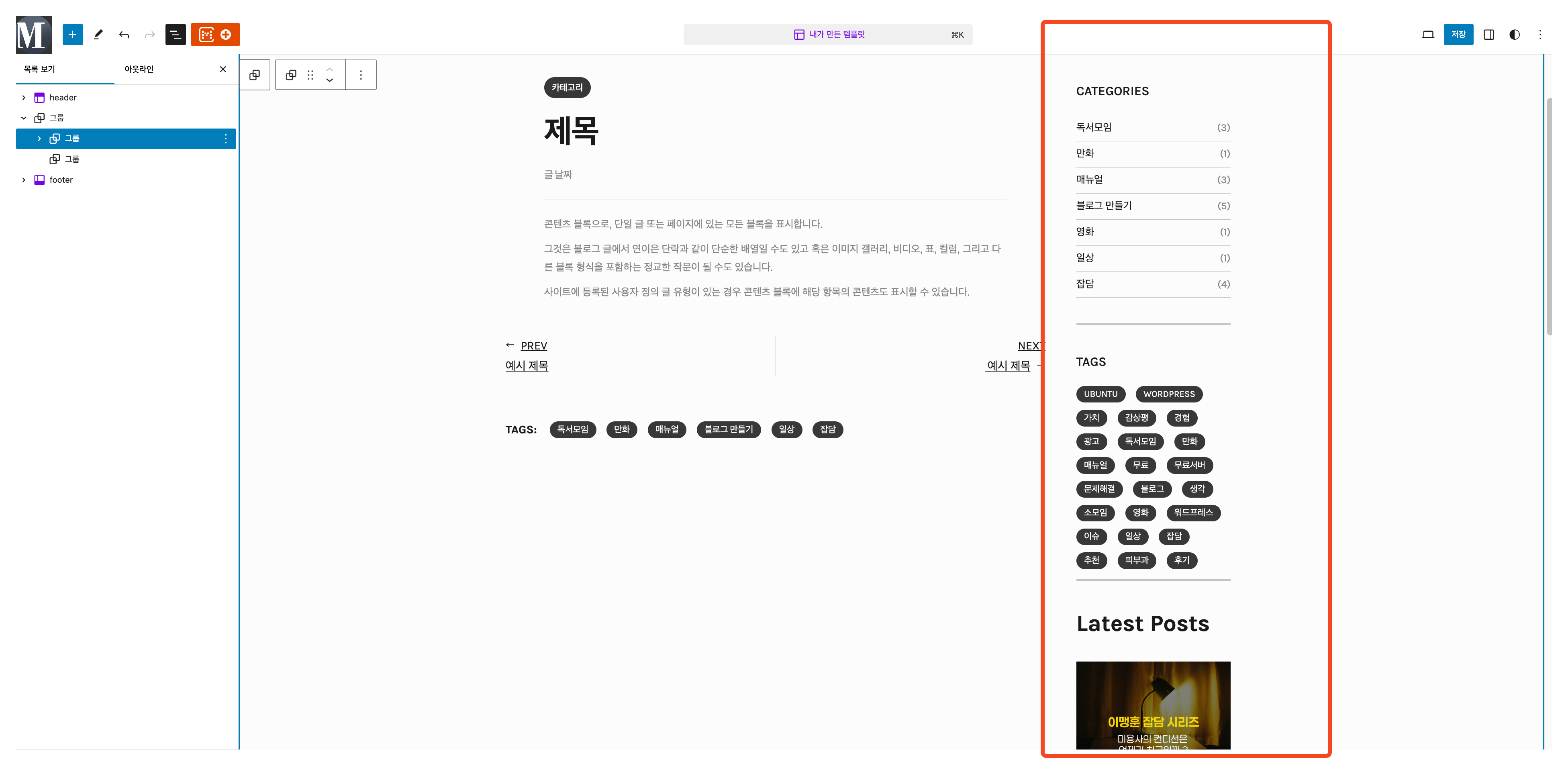 우선 내가 발견한 CM Blog를 통해 워드프레스 테마 구조를 조금 알게되었다. 아래 이미지를 보면 좌측에 홈페이지 템플릿 구조가 쭉 나열된다. 그리고 그 한개의 요소를 선택하면 우측의 빨간 박스와 같이 각 요소(Block)의 값을 설정 할 수 있다.