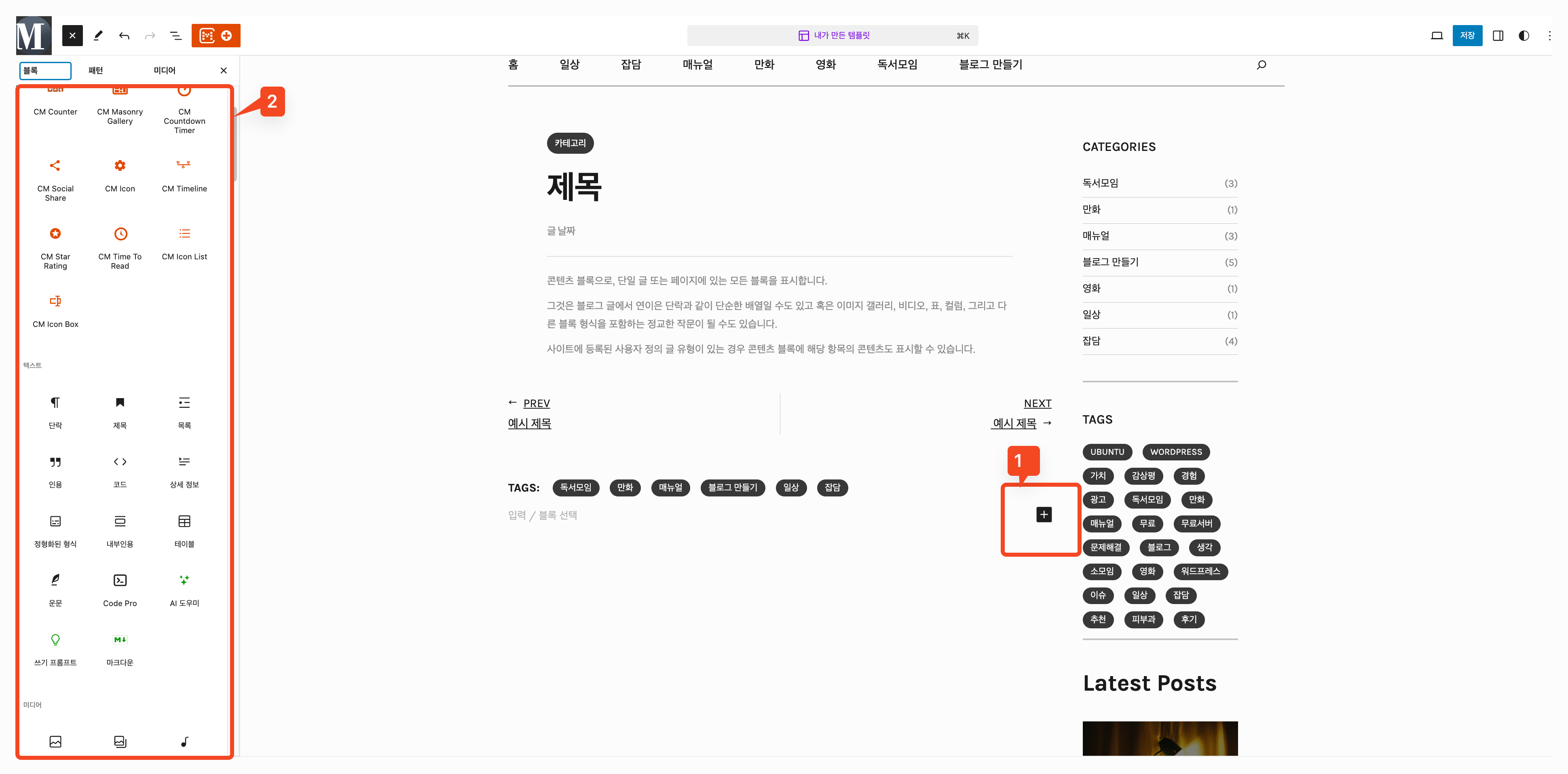 2. 워드프레스가 제공하는 블럭을 선택해서 조립한다.