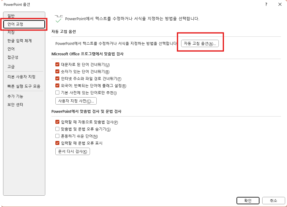 3. 언어 교정 -> 자동 고침 옵션 클릭