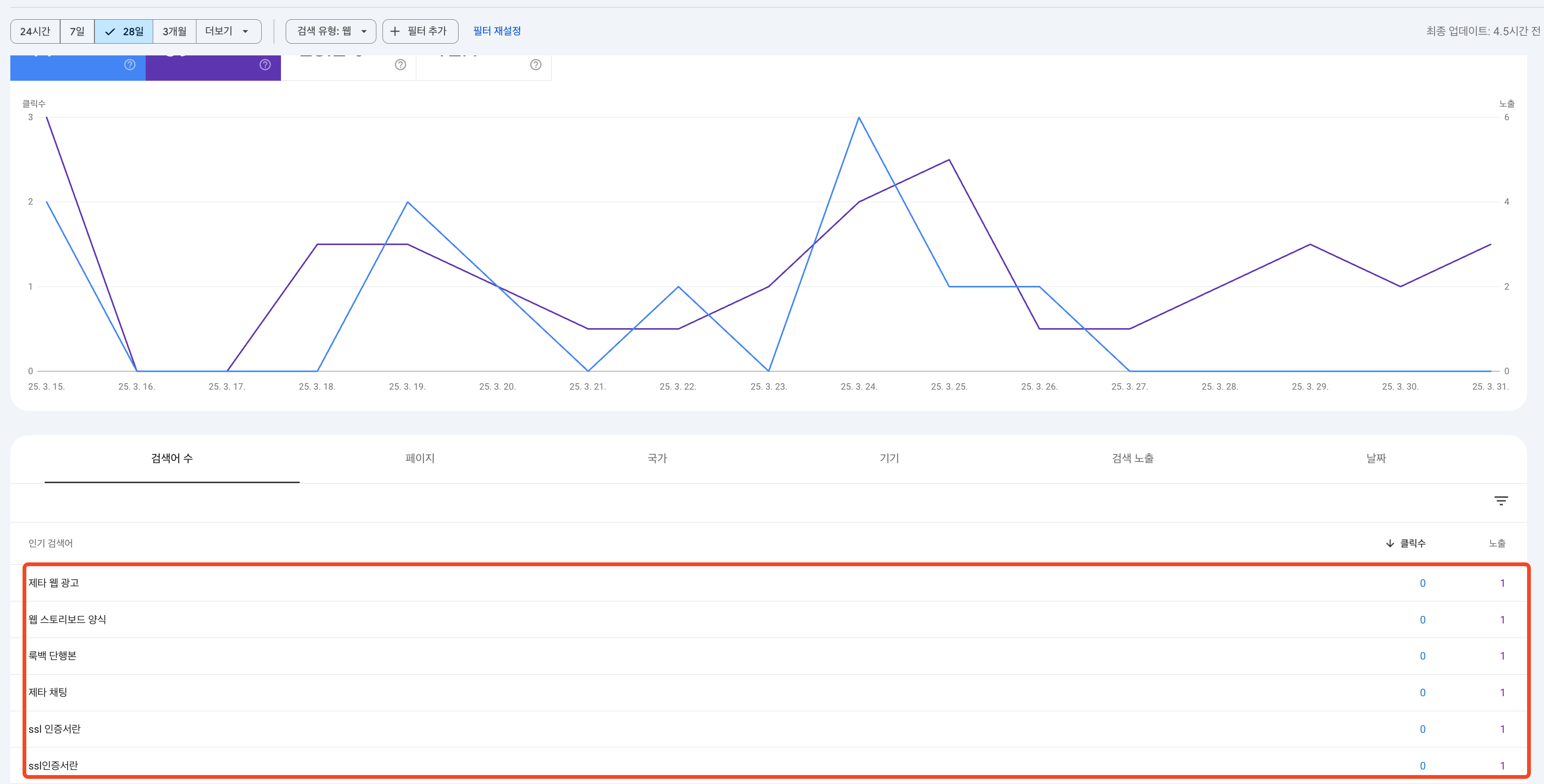 하지만 위의 티스토리 서치콘솔을 보면 그 또한 무위로 돌아갔음을 알 수 있다.