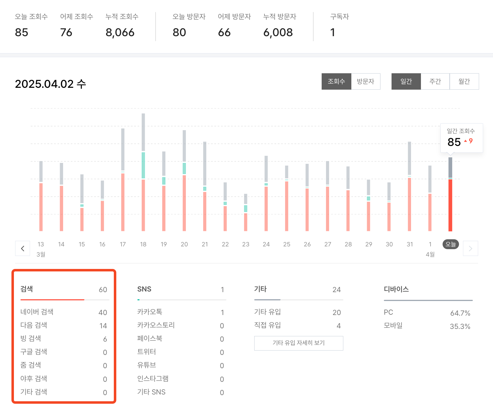 현재 내 티스토리 블로그 상태를 보면 하루 90~100정도의 조회수가 나온다.
