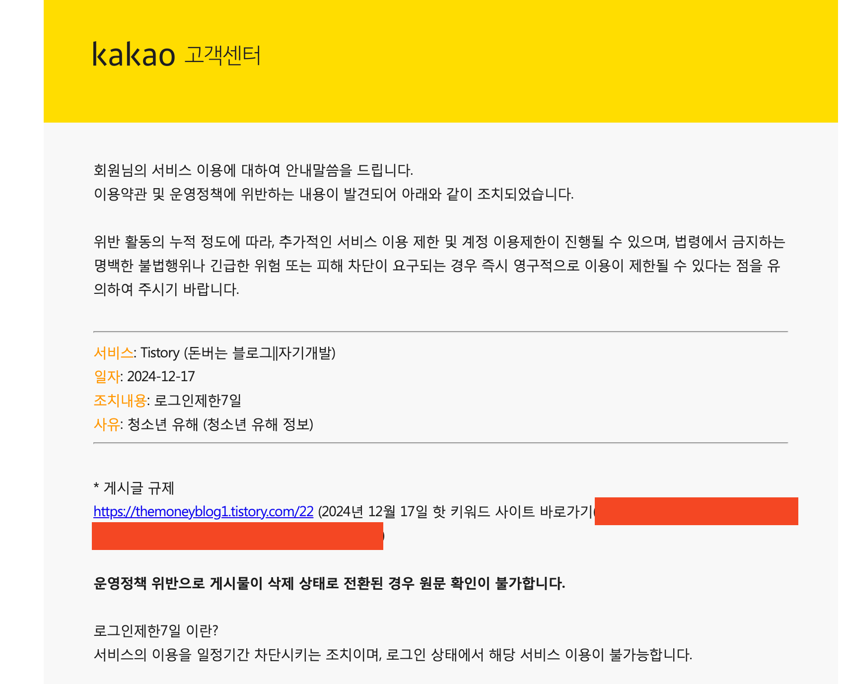 티스토리 정책위반 위반 일주일 정지 후기