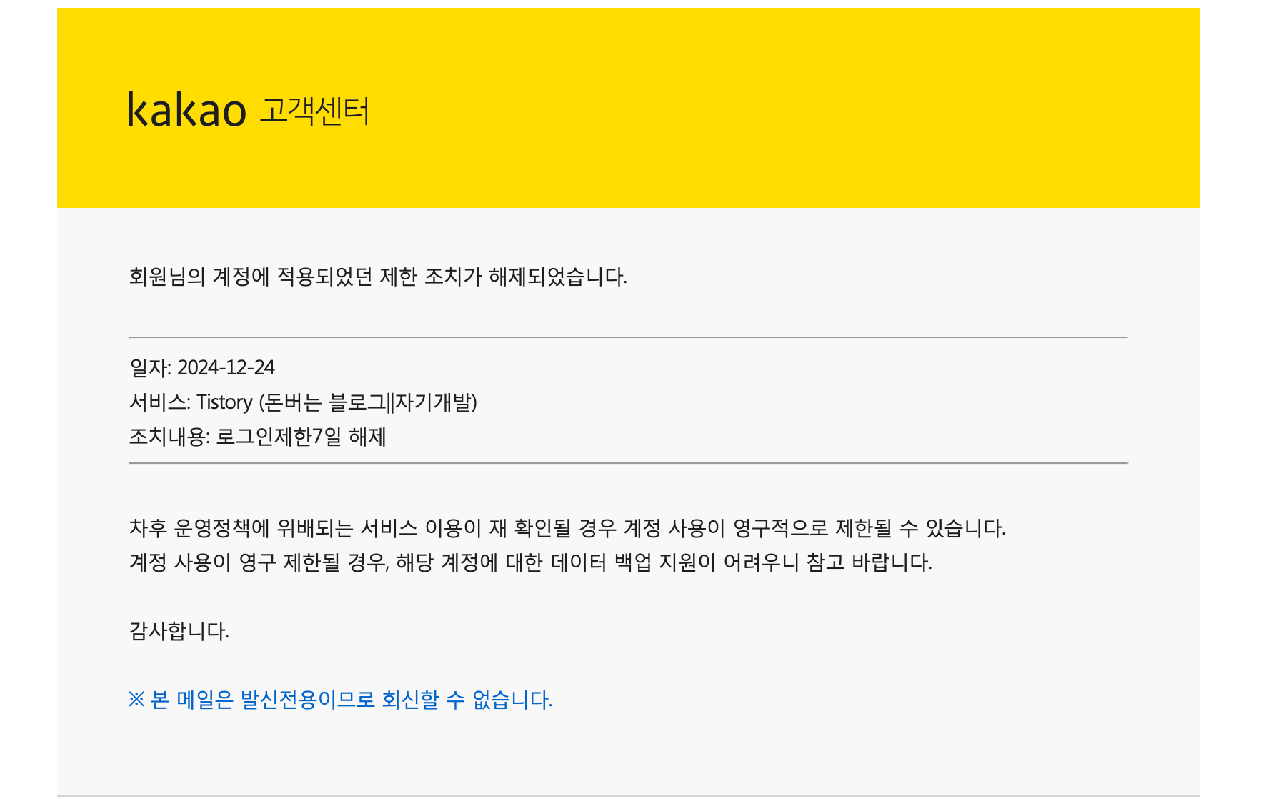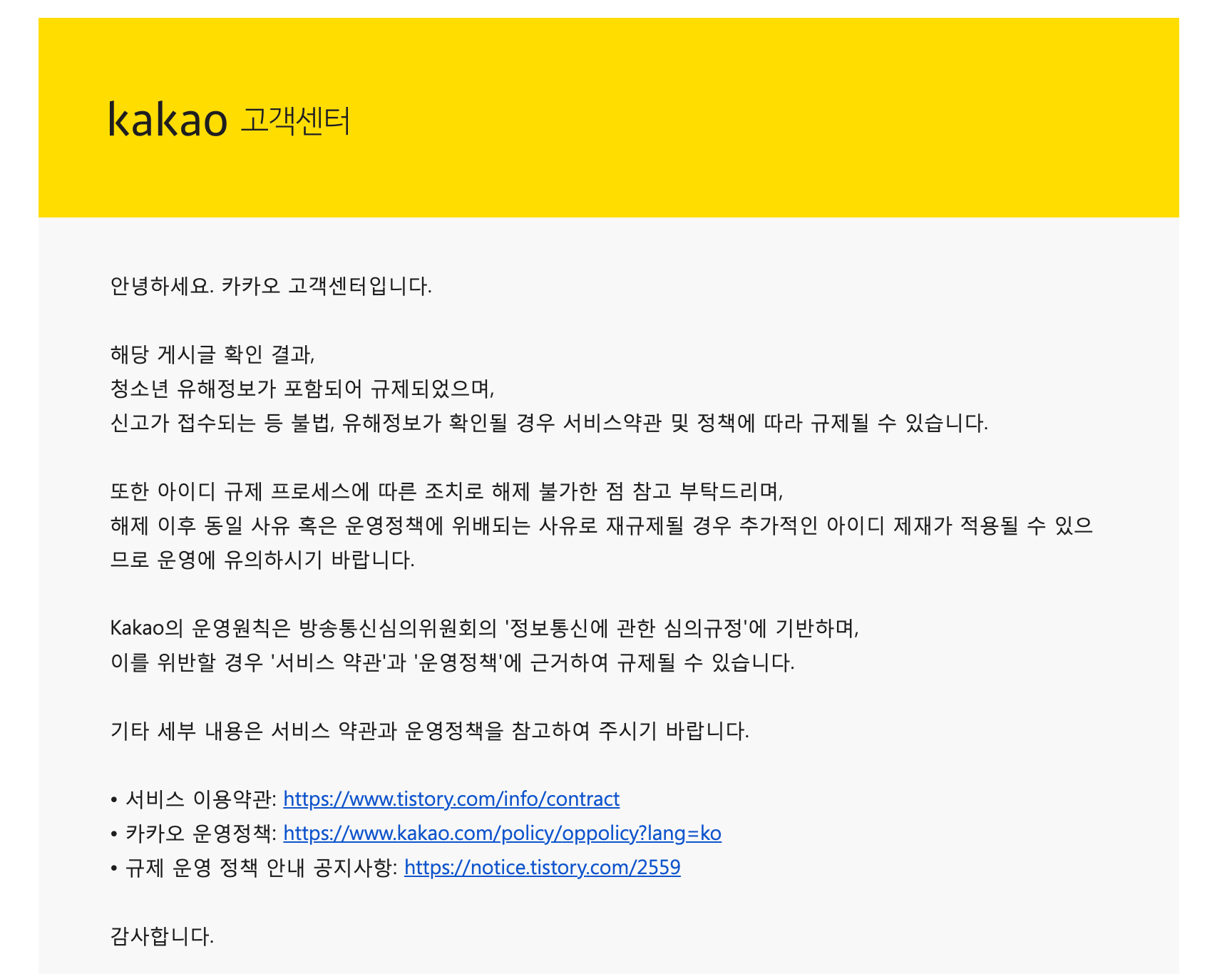 그 당시 내가 억울했던 점은 서브채널에서 일어난 일인데 티스토리 계정을 통째로 막아버렸다는 부분이었다. 잘못은 둘째가 했는데 왜 첫째 밥상까지 뺏어가는가 !! 하지만 잘 생각해보니 너무 당연한 처사였다.