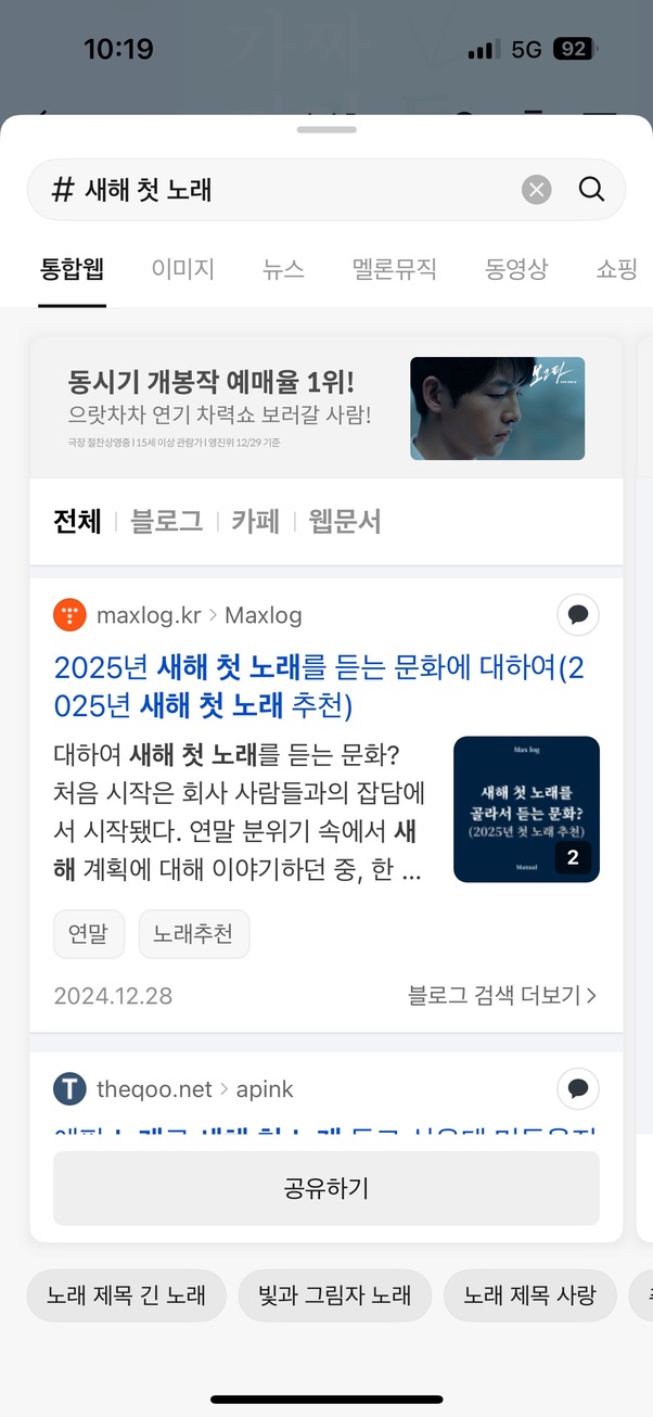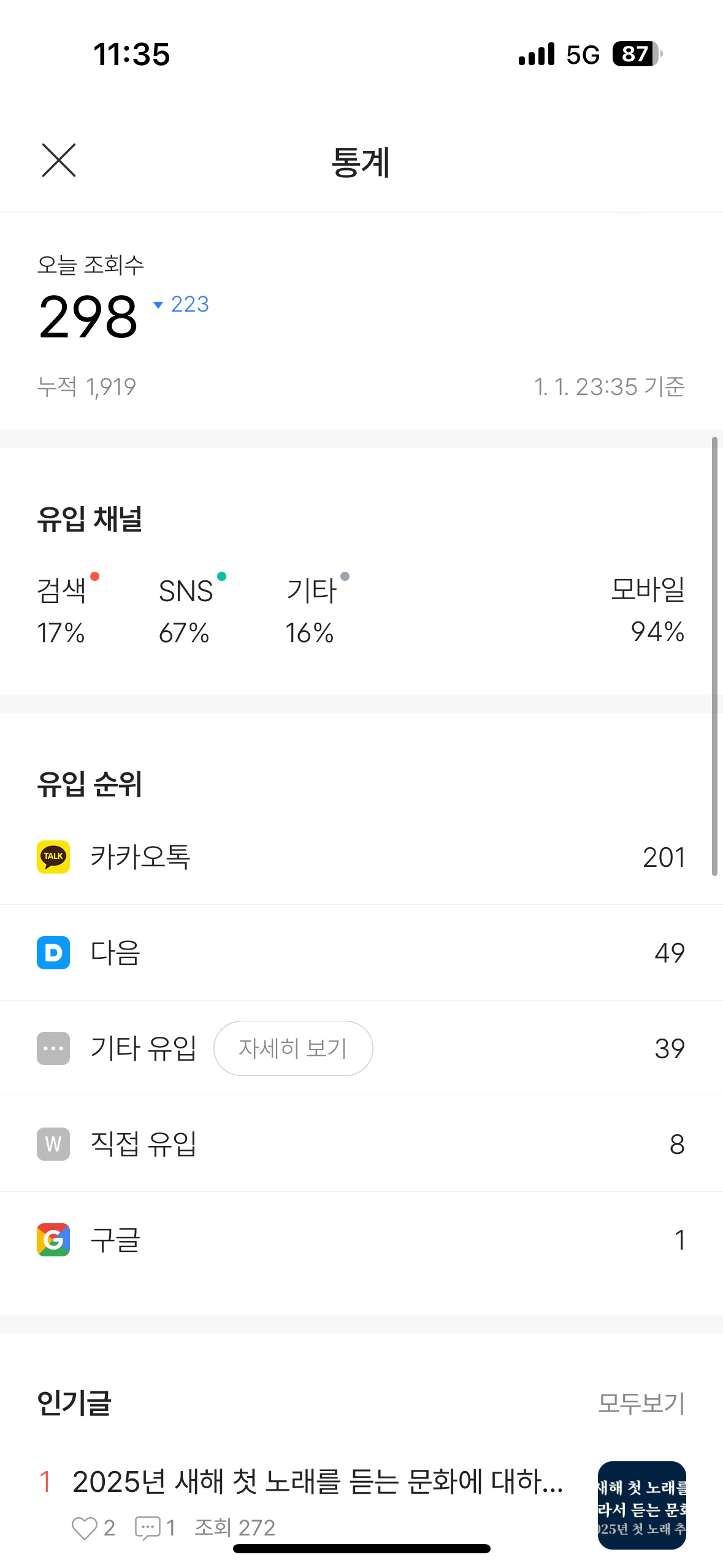 내가 올린 글이 우연히 "새해 첫 노래, 신년 노래 추천" 등의 키워드 검색 1page에 올라 이만큼 트래픽을 발생시킨 것이었다.